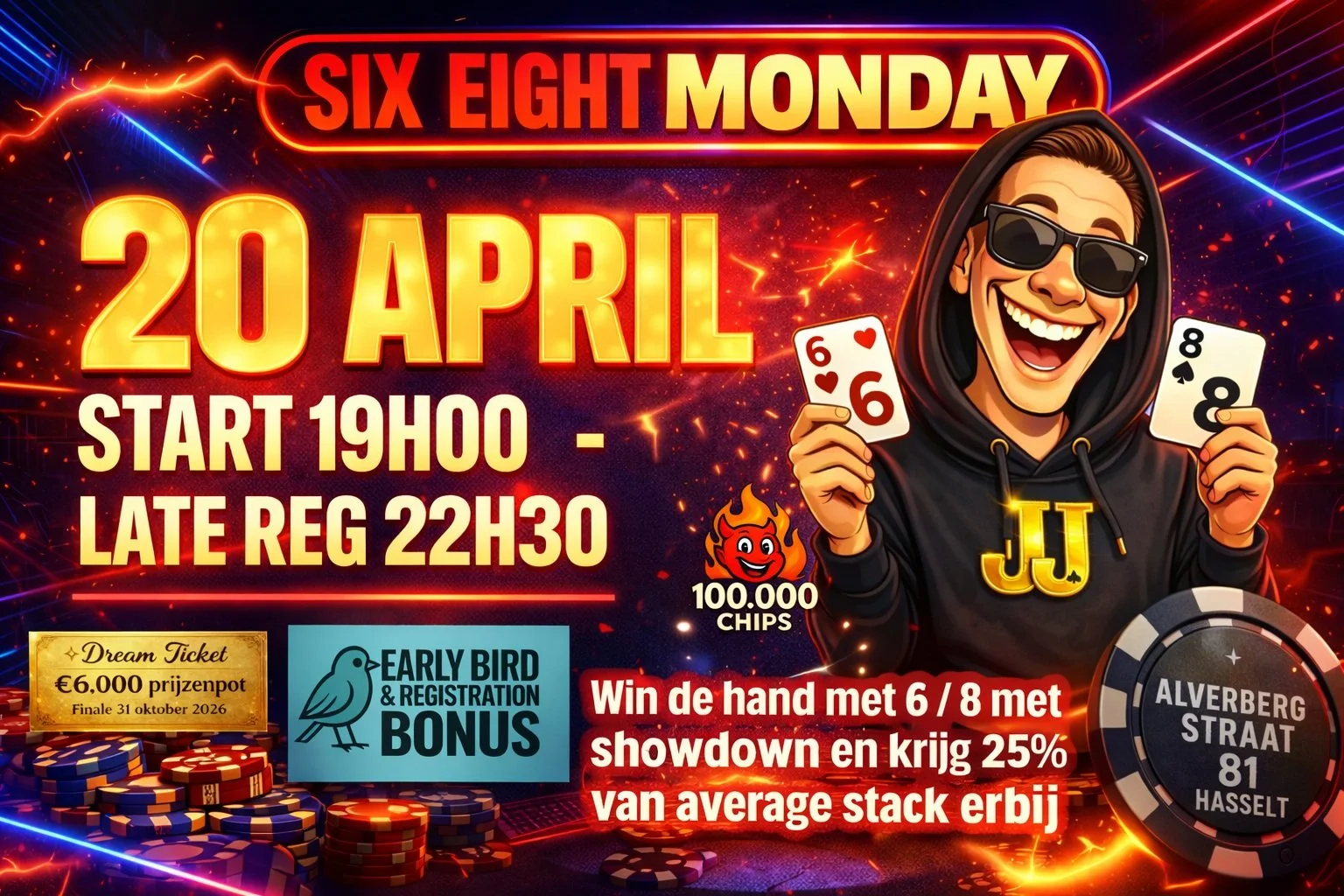 Six Eight Monday is ons unieke eigen concept met een leuke twist aan tafel. Win jij een hand met 6/8 én toon je deze winnende hand tijdens showdown? Dan ontvang je als bonus maar liefst 25% van de momentele average stack extra bovenop je stack. Let op: om de bonus te claimen moet je de hand effectief winnen tegen één of meerdere spelers op de river tijdens showdown.